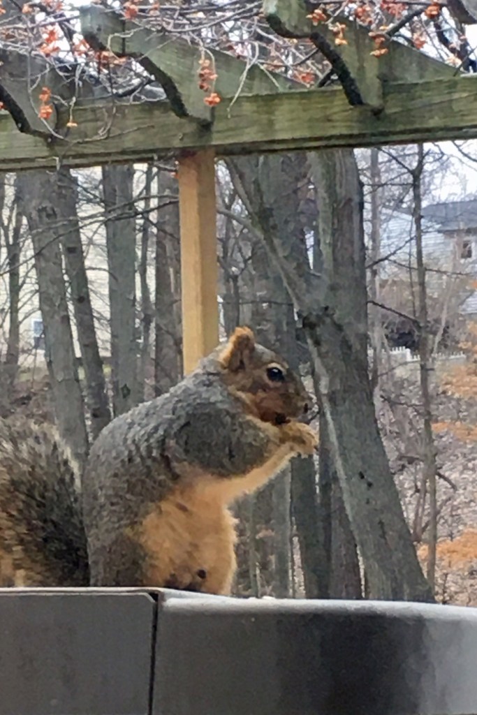 This spring, I have seen increased activity around the feeder. In the early morning, a large male fox squirrel scampers up the steps to beg for fresh seeds. Standing at the sliding doors, he stares into the kitchen with a sideward glance.