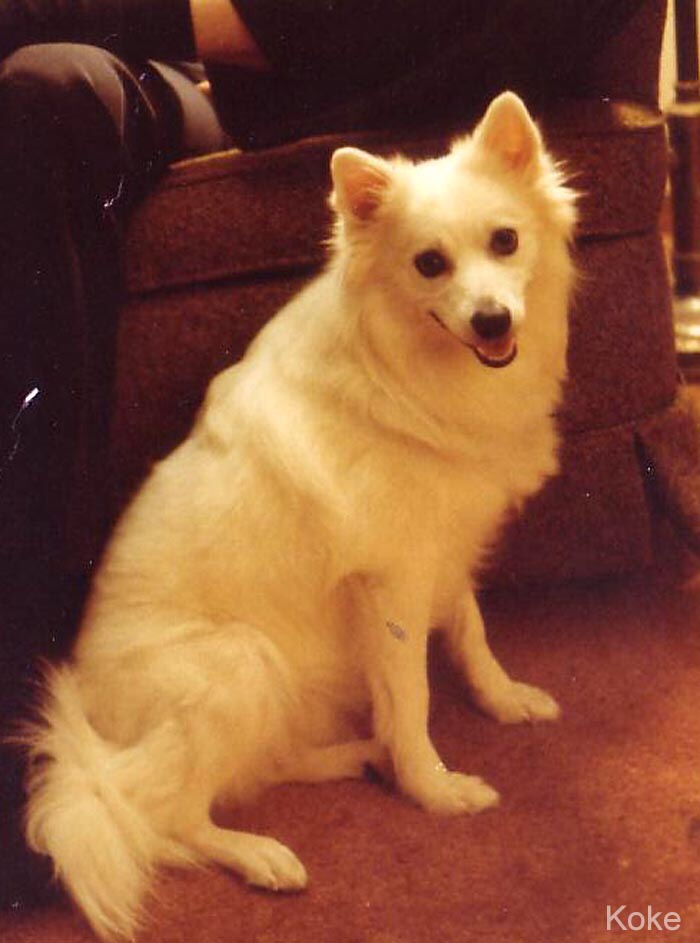 Koke was an American Eskimo Spitz. He was white with a curly tail and black eyes about the size of nickels. He loved walks, running through the snow and chasing squirrels. He was a good companion but he was not a service dog.